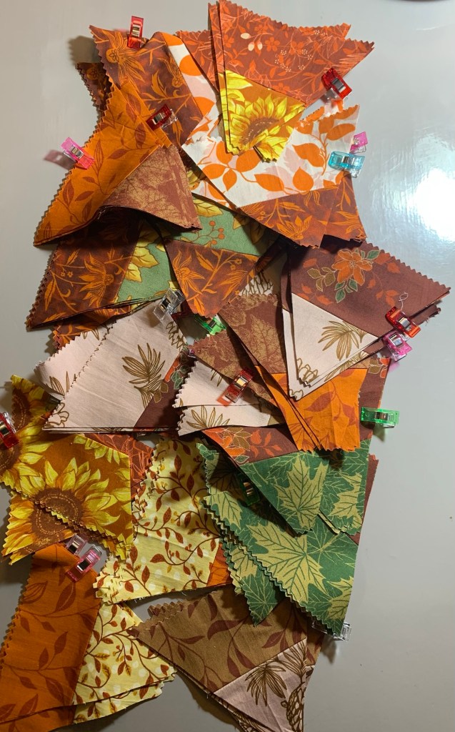 J’ai commencé à couper mes bandes en triangles de 60 degrés :