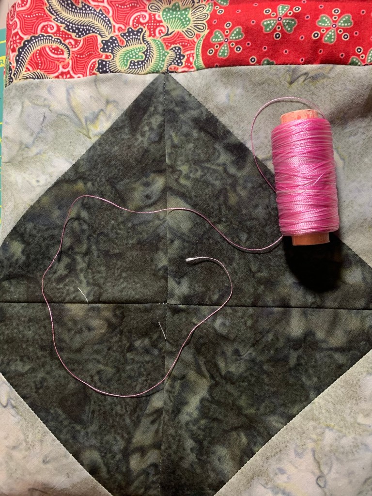 Je cherchais une bobine rose multicolore pour matelasser mon dernier patch « Half Square Triangle ». Ma maman m’a gentiment donné celle qu’elle avait.