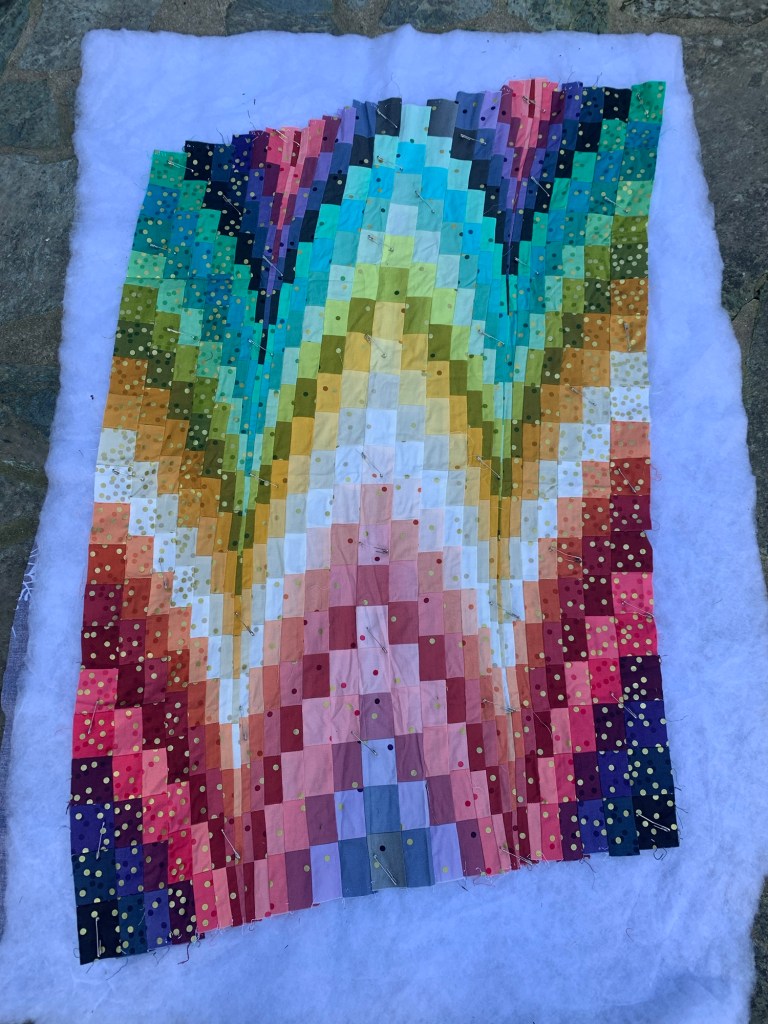 Mon premier barjello. Il est décalé mais je veux le conserver tel qu’il est. Je vais le matelasser en piqué libre avec un fil gris et ensuite en faire un sac.