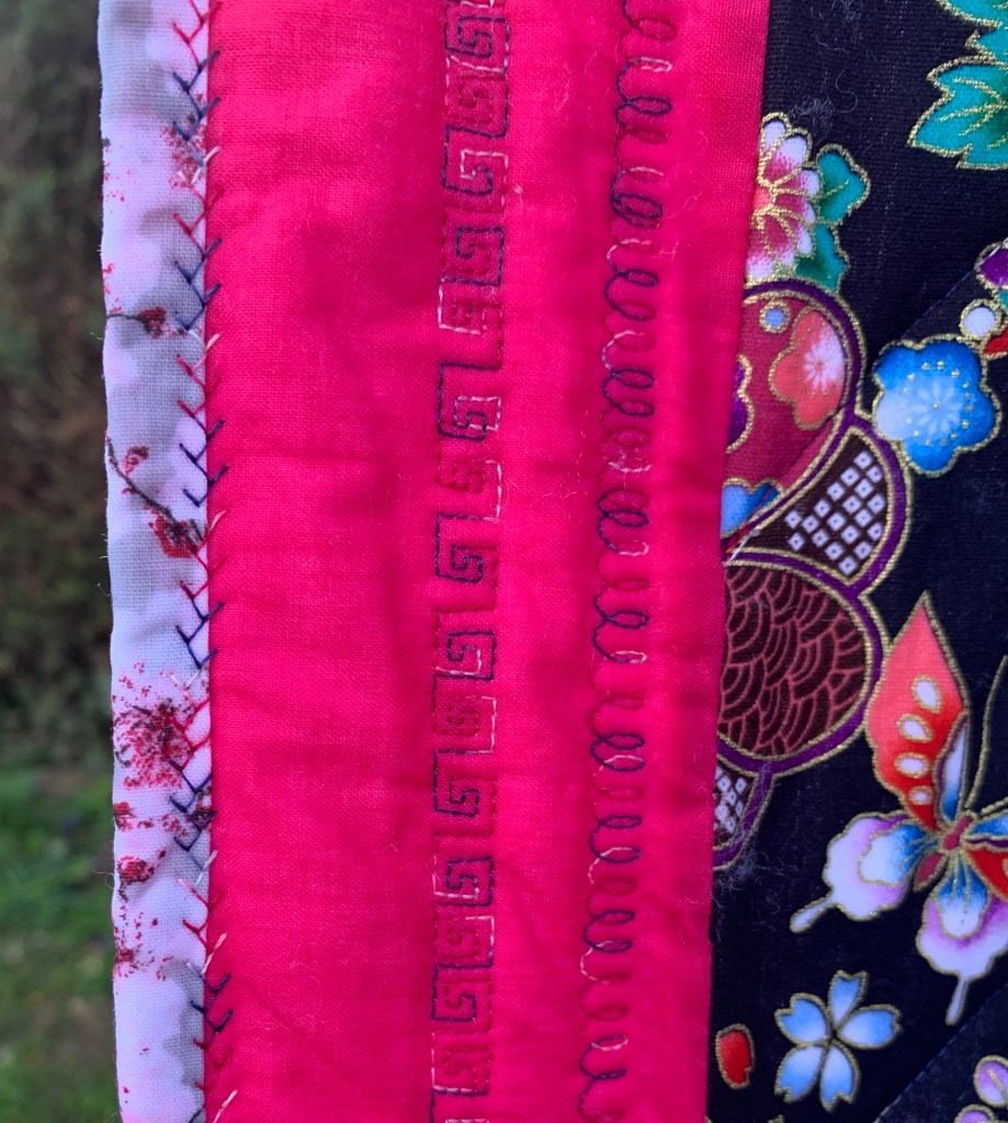 Le Matelassage de la bande extérieure ainsi que la couture de la doublure réalisés à la machine à coudre, avec des points de broderie différents.
