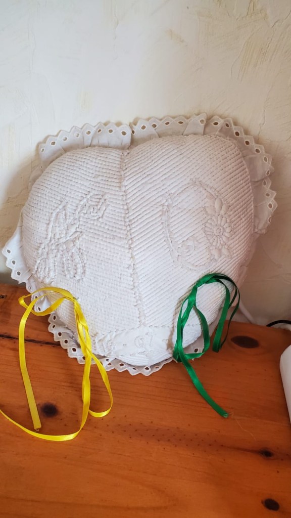 J’ai réalisé en 1999 le coussin pour les alliances pour le mariage de ma soeur et de mon beau-frère.