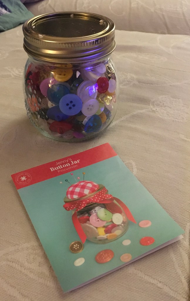 Un kit pour réaliser un coussin en utilisant certains des boutons contenus dans le pot.