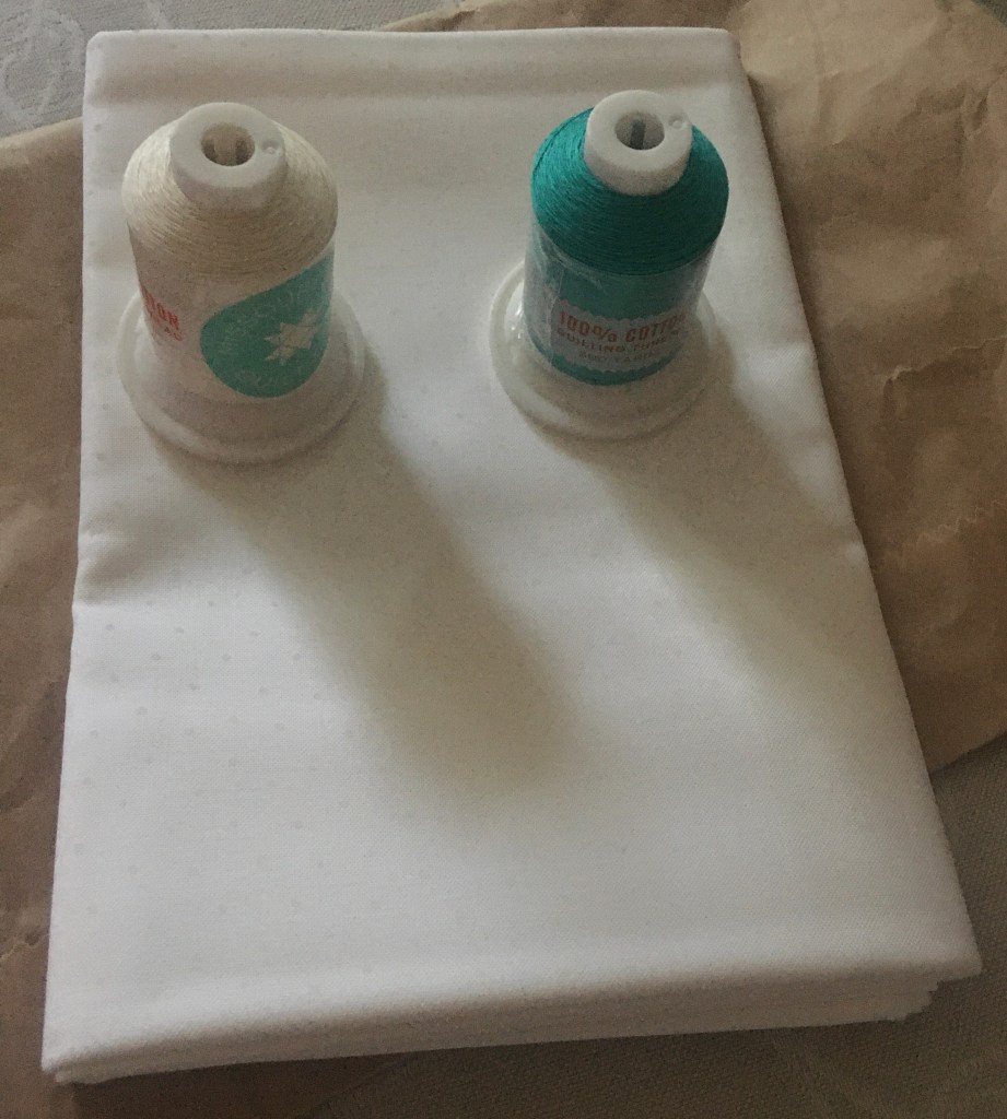 Un magnifique tissu blanc légèrement moucheté et 2 bobines 🧵 de fils.