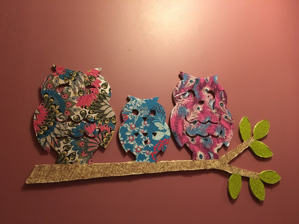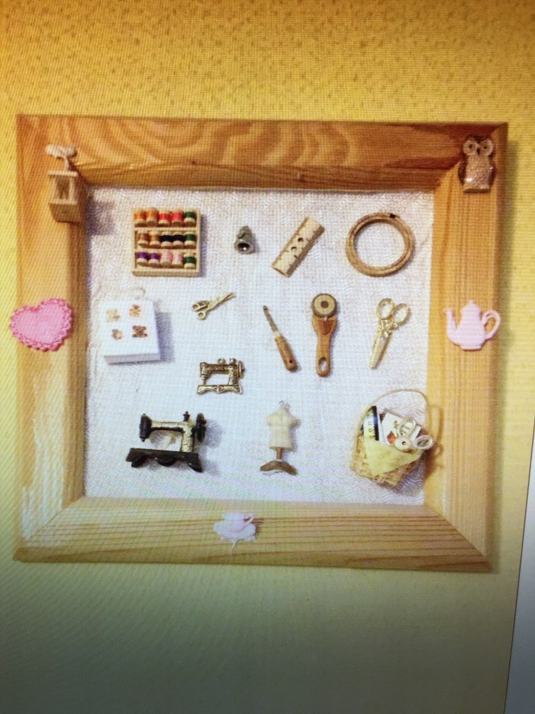 Tableau représentatif d’une quilteuseMon support de bobines réalisé par mon mari et mon fils. Mon pegboard qui me permet d’avoir accès à tout mon matériel de patchwork Mon tapis de sourisFamille de chouettesBoîte de kleenex Support pour les enveloppes Boîte de Kleenex Dessous de verresBoîte pour les sachets de thé