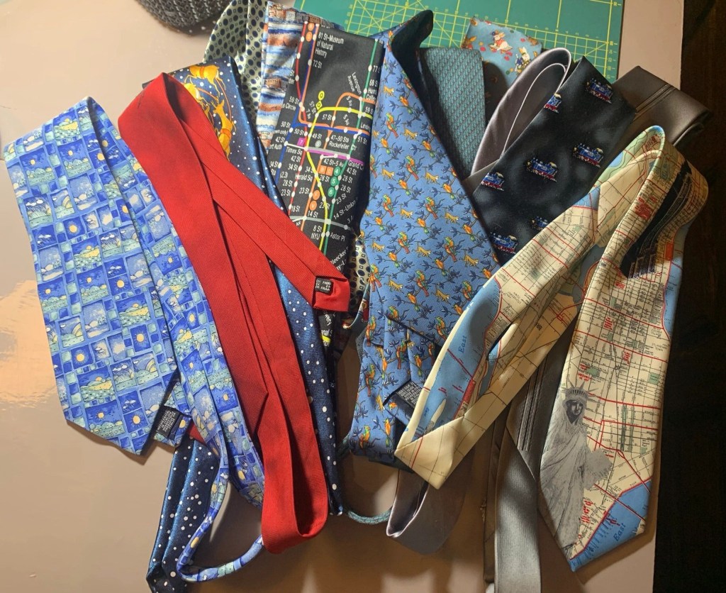 Début décembre, mon père nous a quitté. Nous ne nous y attendions pas. Papa était un passionné de trains 🚂 et avec maman et ma sœur nous lui avions offert plusieurs cravates 👔 originales. J’ai envie de réaliser un patchwork avec certaines d’entre elles. Maman m’a donné celles-là