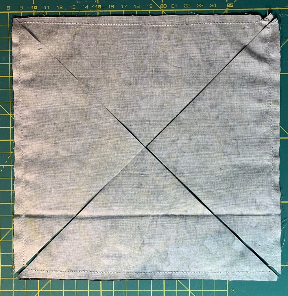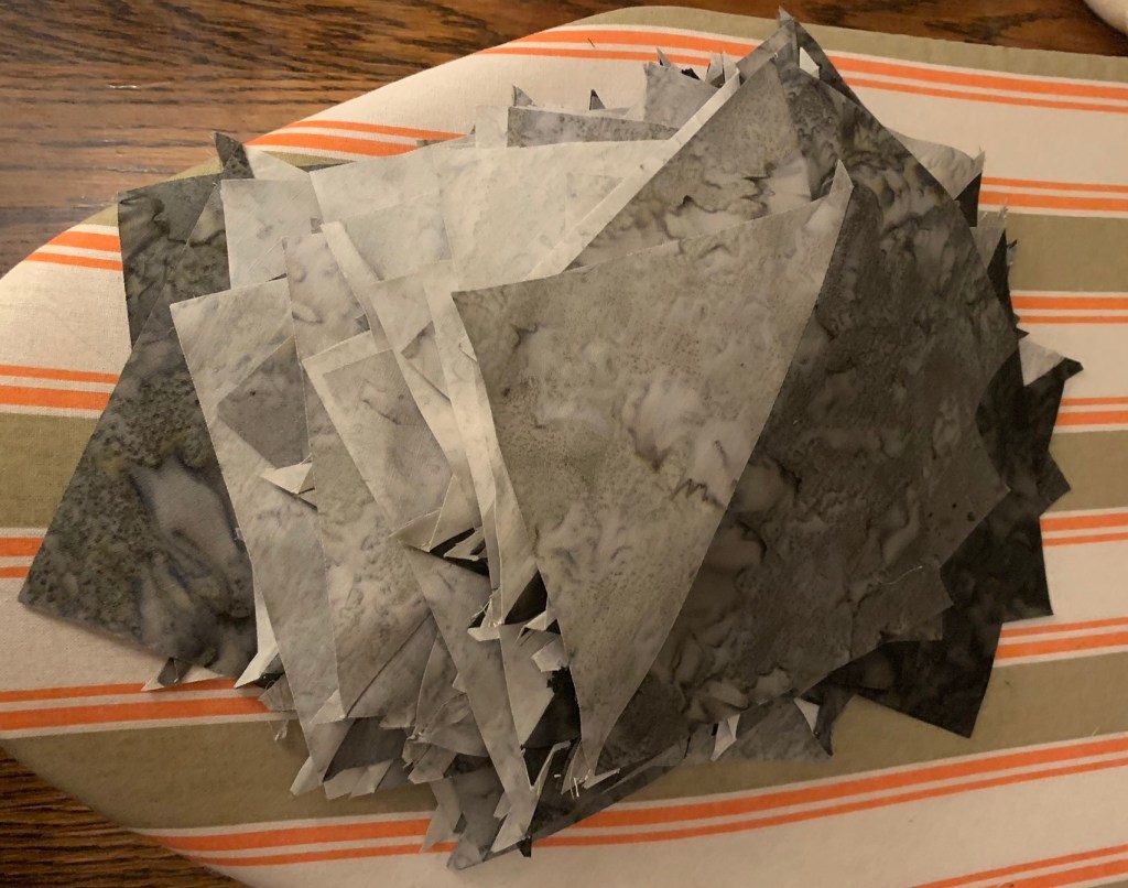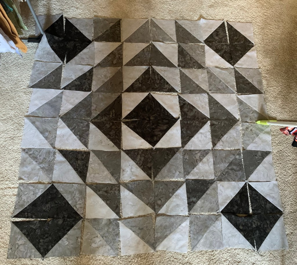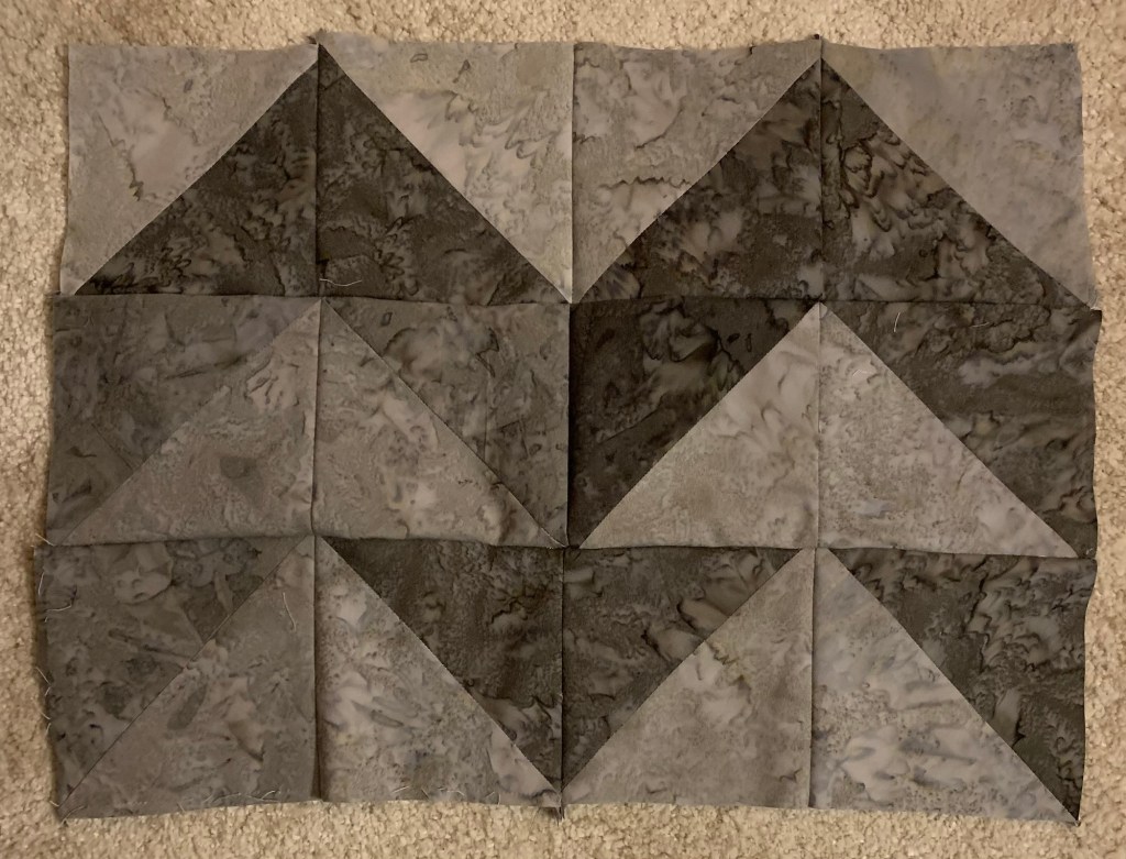 Je cherchais une bobine rose multicolore pour matelasser mon dernier patch « Half Square Triangle ». Ma maman m’a gentiment donné celle qu’elle avait.