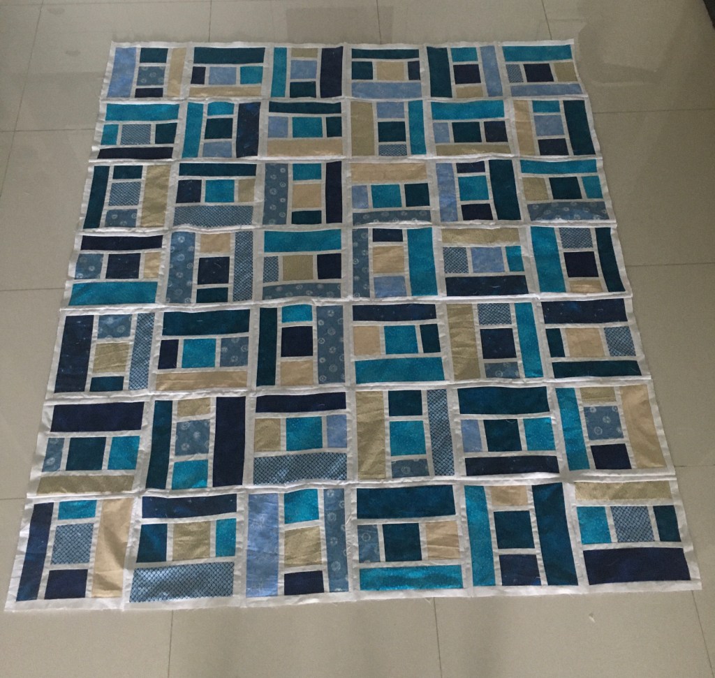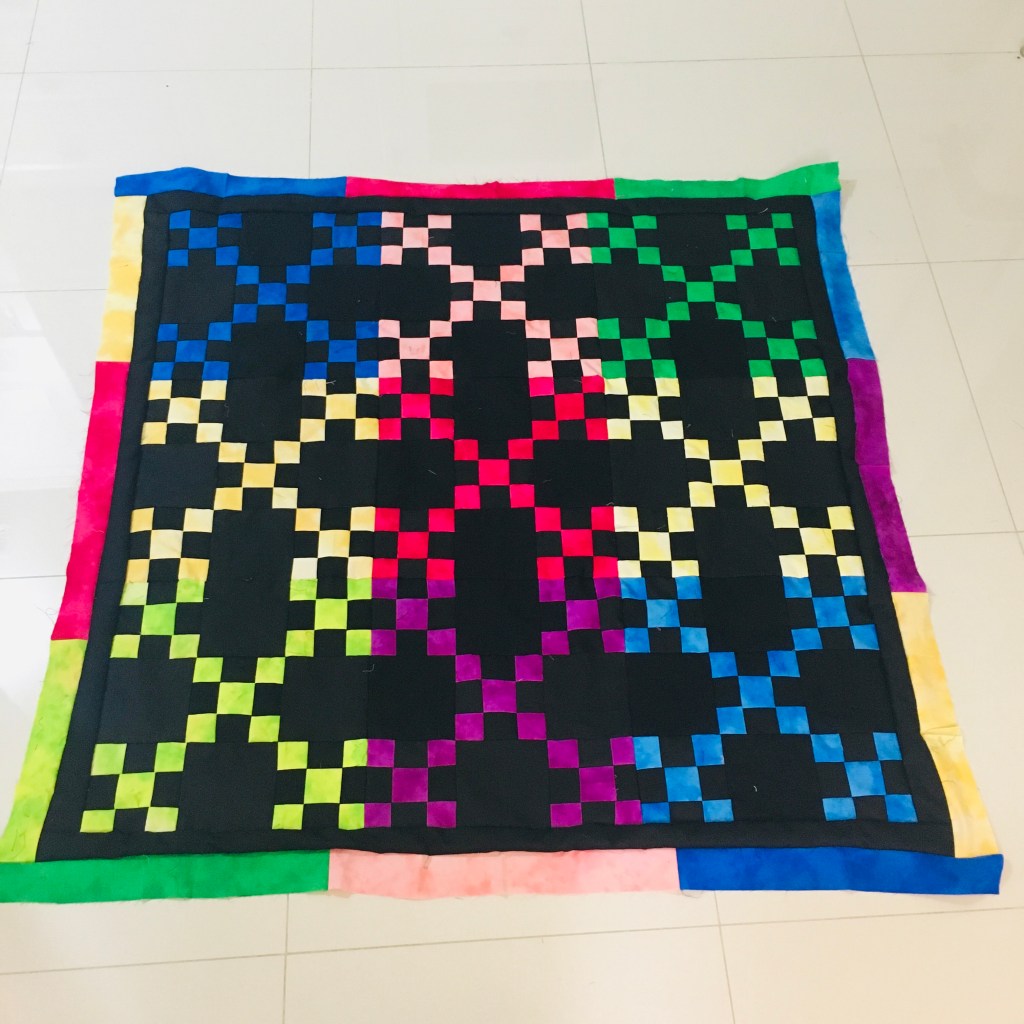Il a choisi ses tissus dans une mercerie à Singapour 🇸🇬 et a décidé de la position des blocs. Il ne souhaite pas mettre de bordure autour.