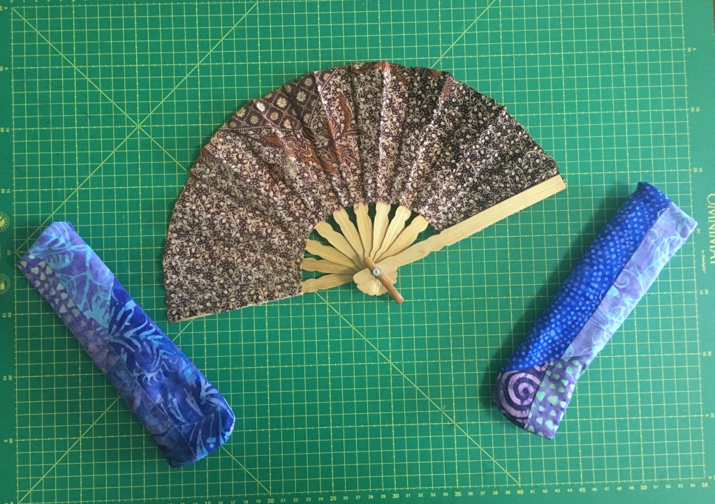 J’ai réalisé des étuis pour des éventails mesurant 4 X 20 centimètres, en utilisant mes chutes de batiks.