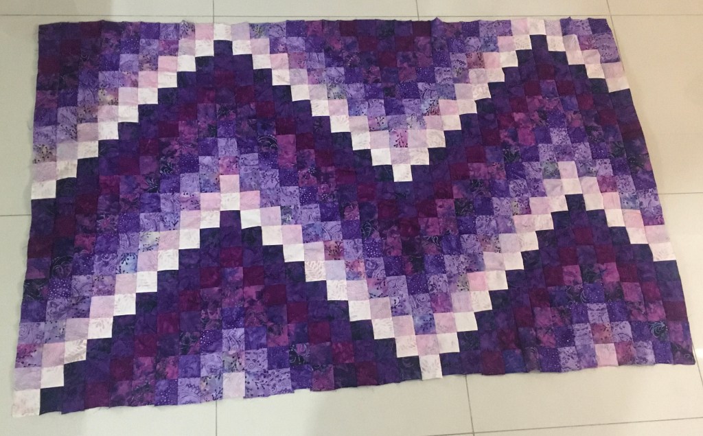 J’ai utilisé un jelly roll dans les couleurs qu’elle apprécie. J’ai assemblé les bandes de batiks entre elles, puis en tubes pour les couper en bandes de 2,5 inch, pour ensuite les positionner de sorte à donner un effet de mouvement au patchwork.